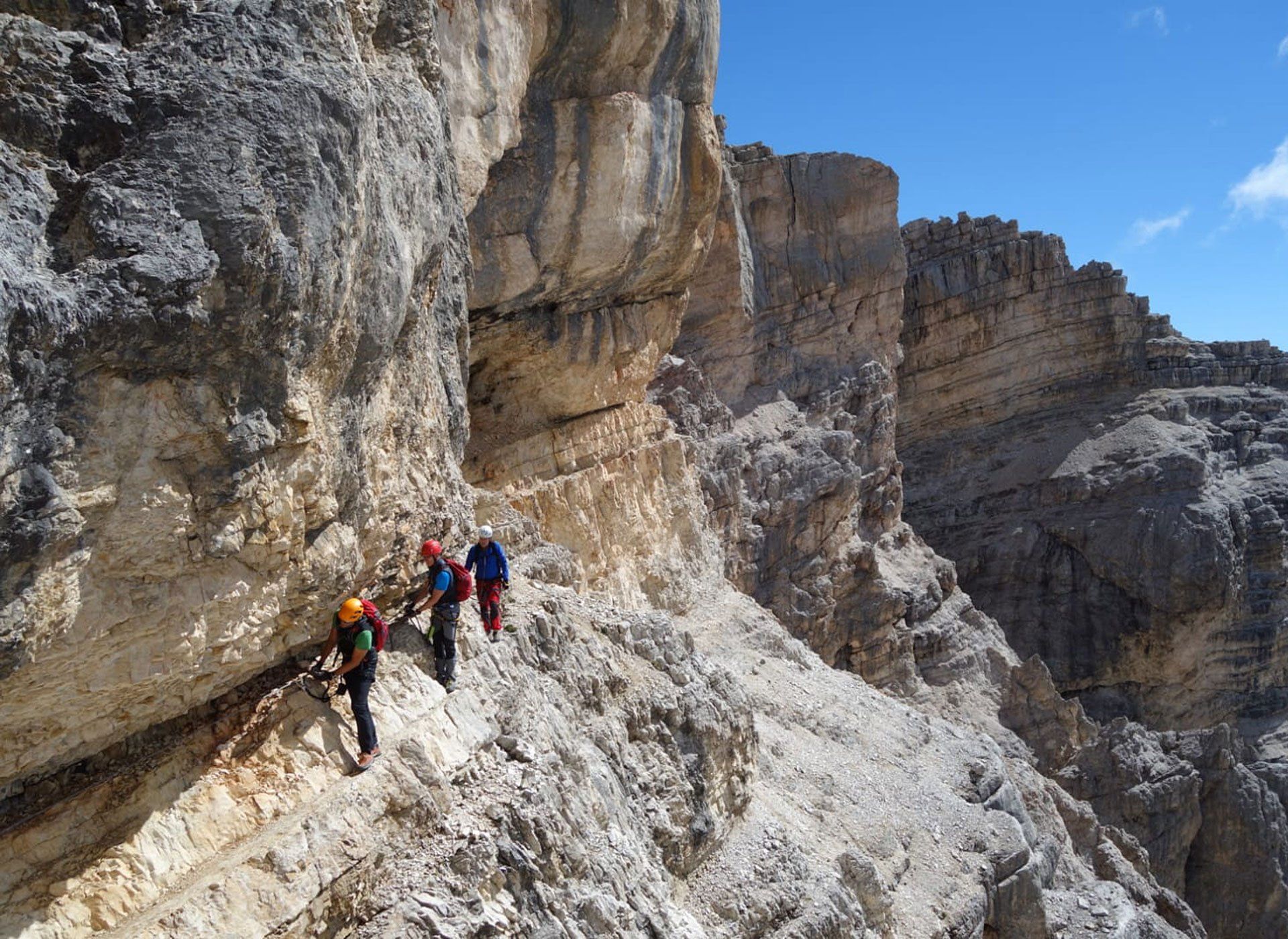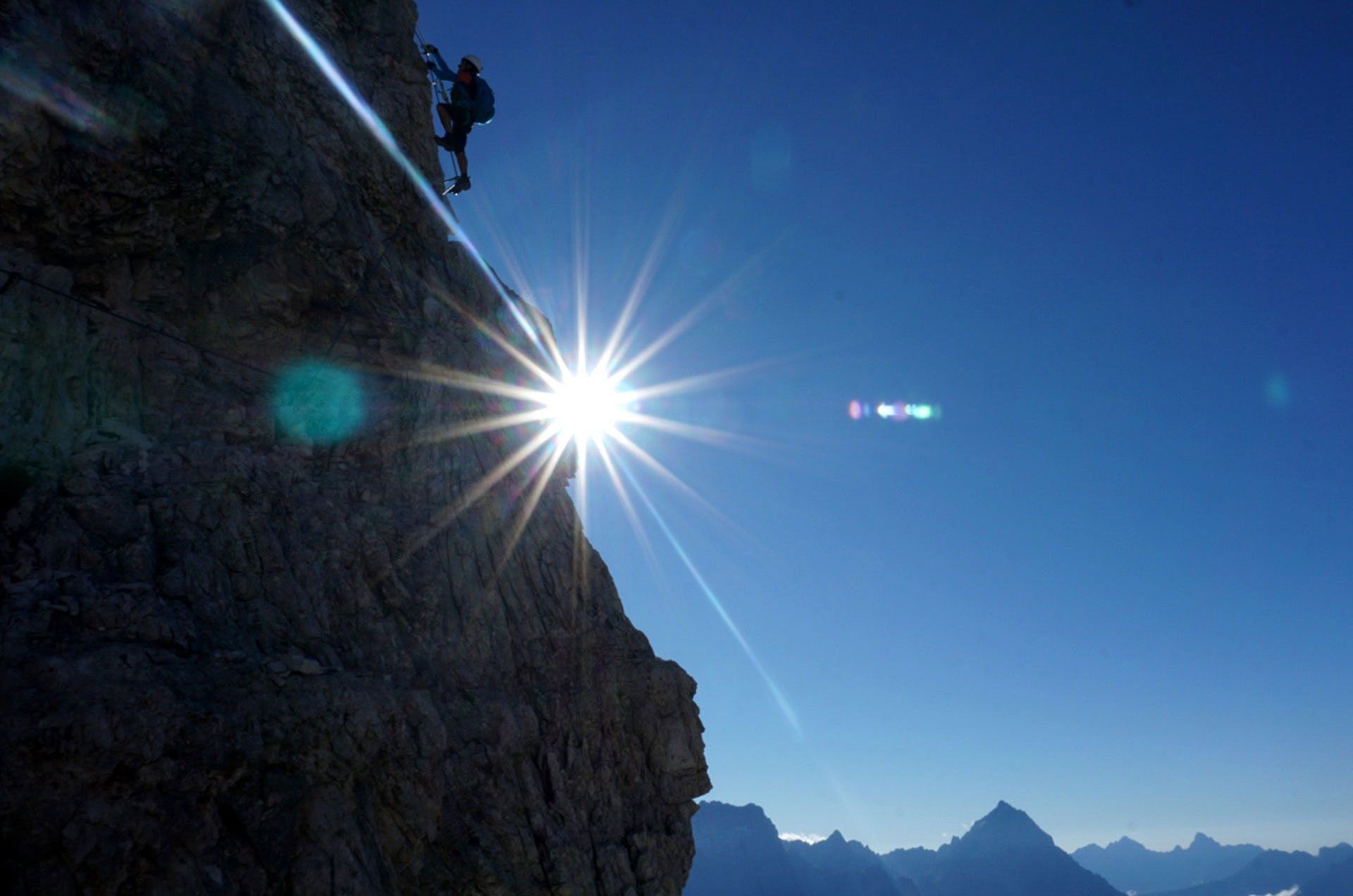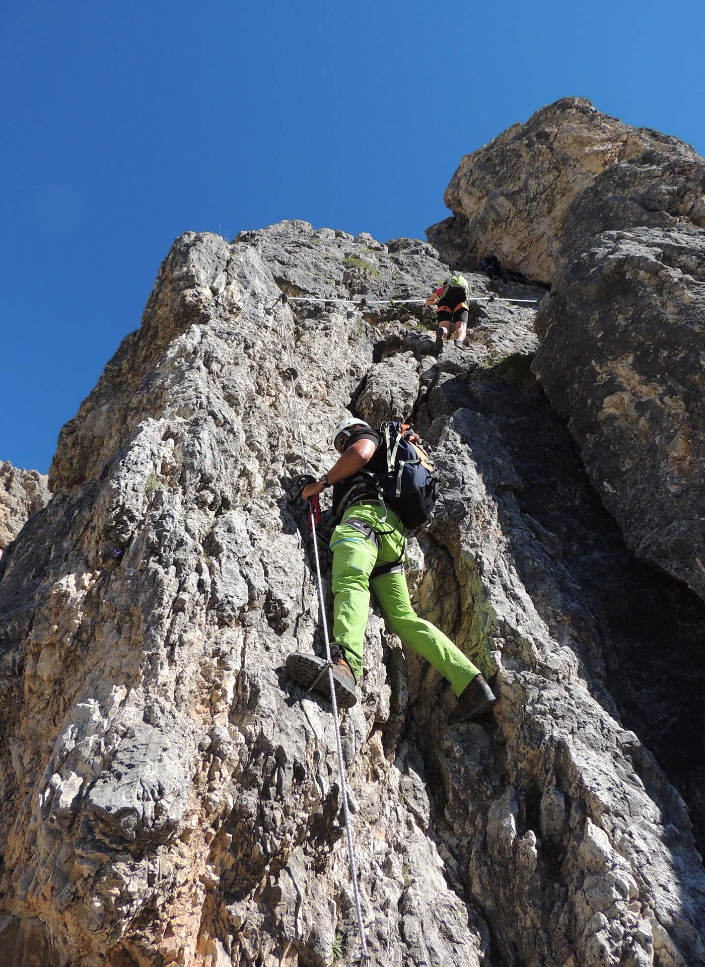 Via Ferrata – Eisenweg – was für ein sprechender Name für versicherte Steige in den Alpen. Besonders berühmt und spektakulär in den Dolomiten. Sie machen Gipfel, Grate und Überschreitungen auch für „normale“ Bergsteiger zugänglich. Für passionierte Kletterer zwar meist unschwierig zu begehen, sind die Klettersteige in der Pala, Civetta, Sella, Brenta, Ampezzaner Dolomiten – um nur einige Gebiete zu nennen – doch immer ein grandioses Erlebnis. Und man muss ja die Stahlseile und Trittstufen nicht verwenden … ich erinnere mich noch an eine „fast berührungsfreie“ Begehung des Bolver-Lugli in der Pala in meinen besten Kletterjahren.