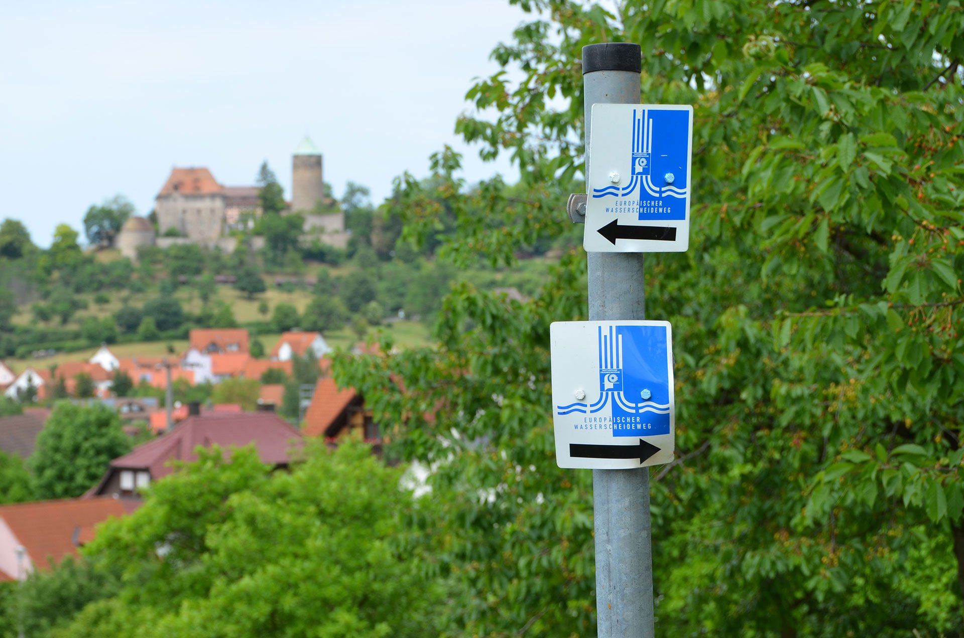 Was ist denn bitte ein „Wasserscheideweg“? Mitten durch das westliche Mittelfranken zieht sich die Europäische Wasserscheide, d. h. nur wenige Kilometer entfernte Quellen schicken ihr Wasser mal ins Schwarze Meer und mal in die Nordsee. Und genau dazwischen verläuft auf der Höhe ein idyllischer, knapp 100 km langer Wanderweg. Auch gut mit dem Mountainbike befahrbar. In einem oder ganz gemütlich in zwei Tagen. So lernt man seine alte Heimat gleich nochmal kennen.