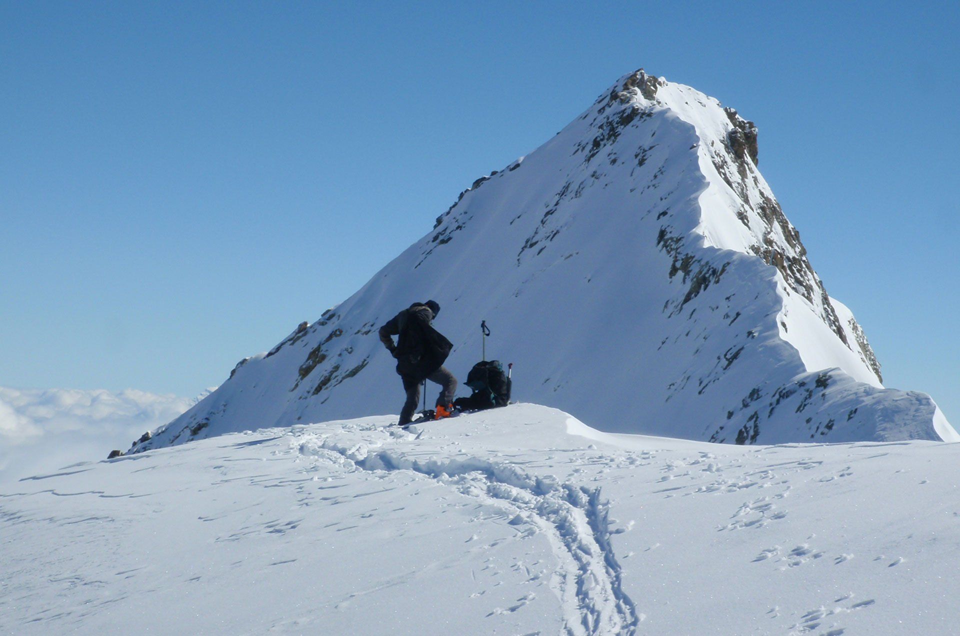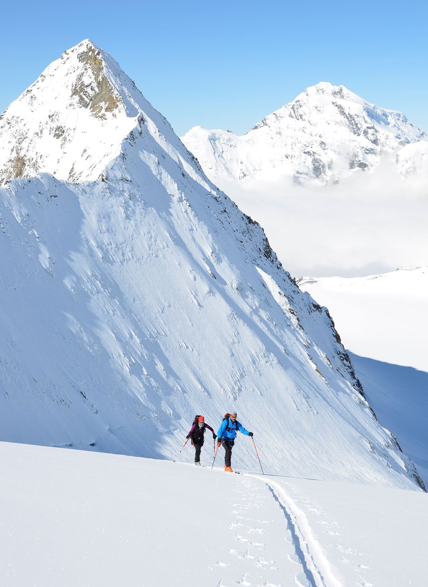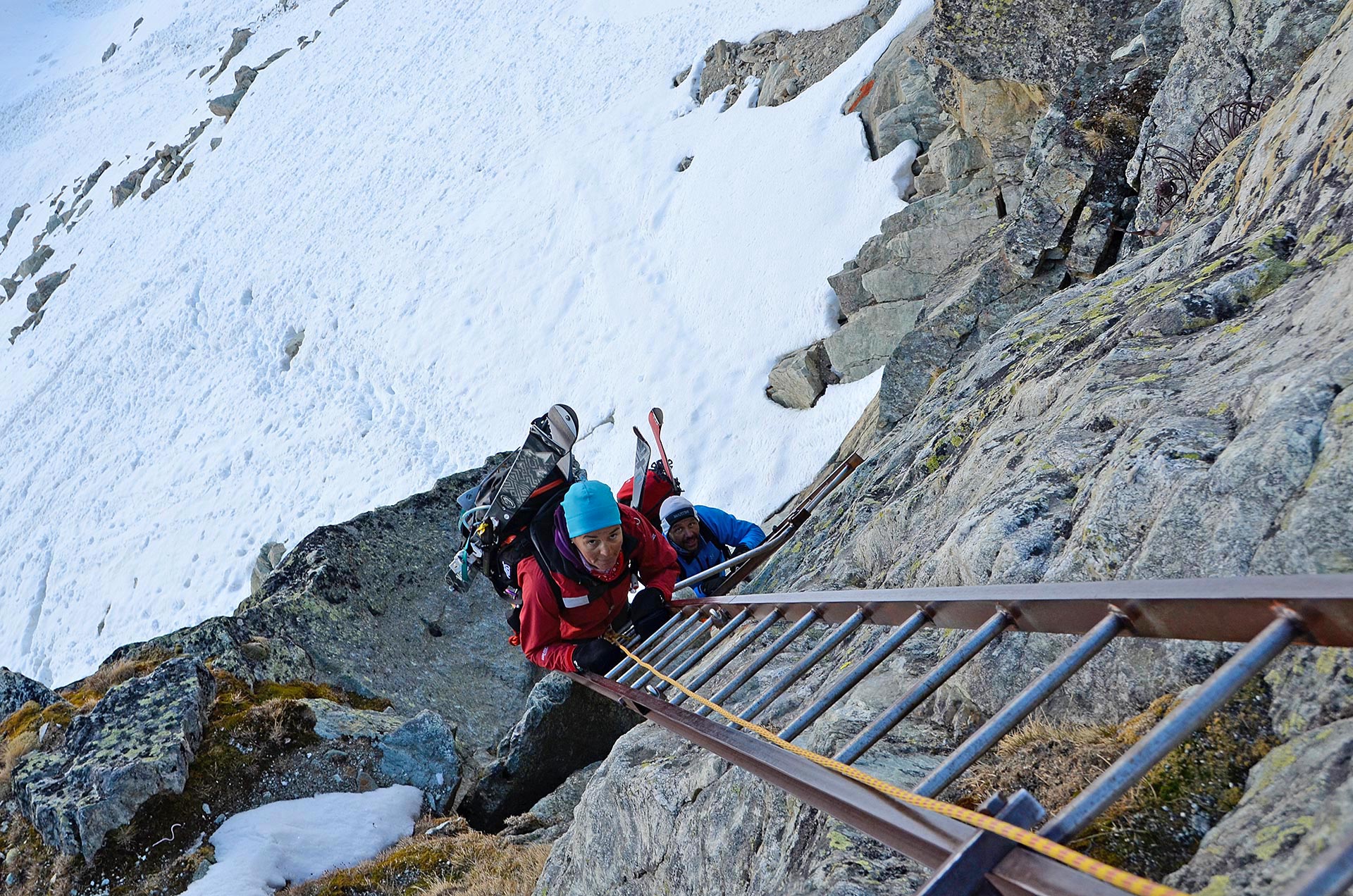Am Talschluss des Val des Dix in den Walliser Alpen erhebt sich mit 3870 m der Mont Blanc de Cheilon. Ein sehr lohnender Skiberg, nur das letzte Stück bis zum Gipfel muss zu Fuß in Angriff genommen werden. Auch der Hüttenzustieg zur Cabane des Dix von Arolla aus hat’s in sich: Der Übergang über den Pas de Chèvres erfolgt über einige luftige Leitern.