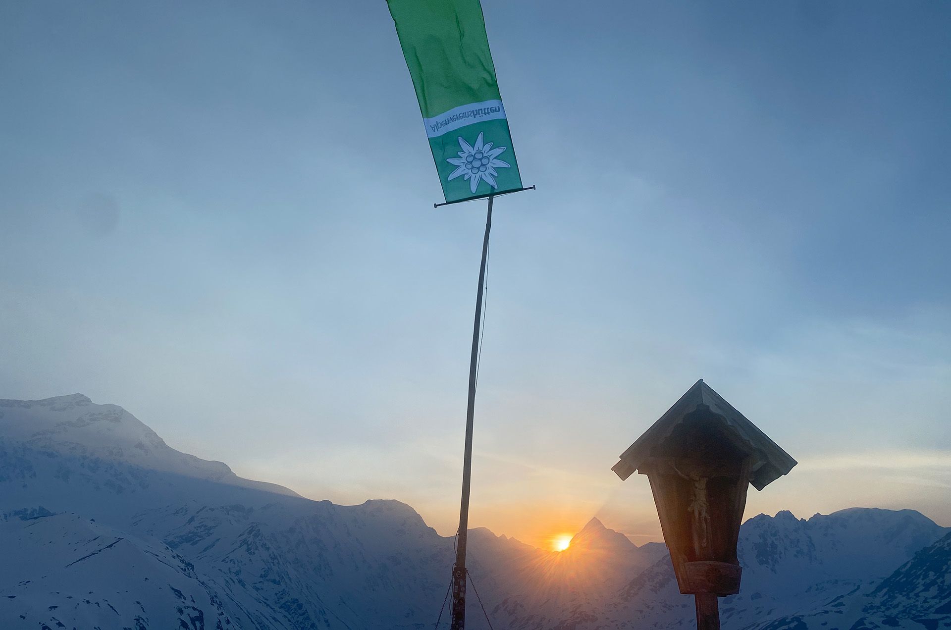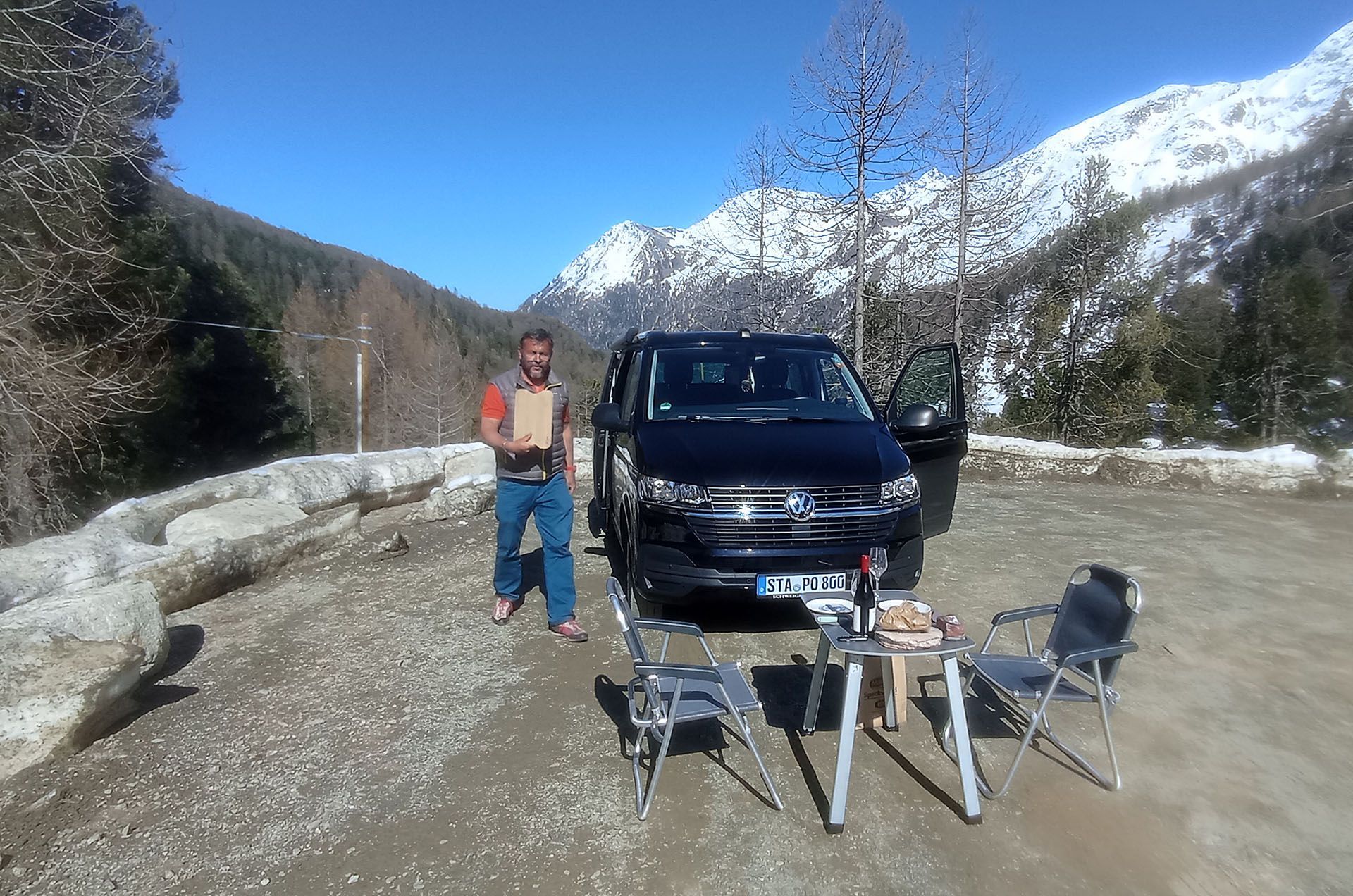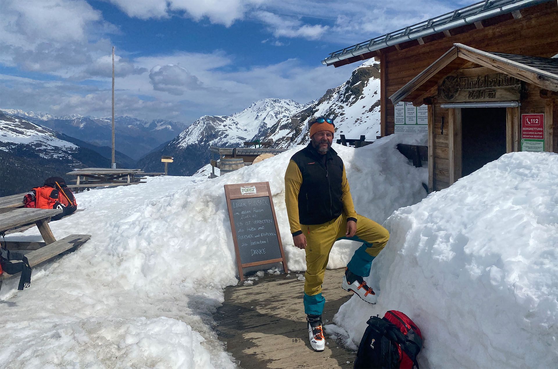 Getreu unserer neuen Planungsdevise „ Tour planning follows weather forecast“ hatte es uns im April 2025 nach vielen Jahren wieder einmal in den nördlichen Ortler – genauer gesagt an das Ende des Marteller Tales – verschlagen. Die Anreise erfolgte über Südtirol, so dass wir unsere Hüttenbrotzeit in der „Moser Speckalm“ entsprechend aufstocken konnten. Am Ende des Sacktales befindet sich ein großer Parkplatz, auf dem wir unser mobiles Basislager parken und einrichten konnten. Nach der ersten Skitour auf die Madritschspitze konnten wir im Windschatten unseres VW Busses die letzten Nachmittagssonnenstrahlen mit einem Bier aus dem bordeigenen Kühlschrank genießen. Der Bus als Hüttenersatz stellte sich recht gemütlich heraus und wird sicherlich nicht das letzte Mal zu diesem Zweck eingesetzt.