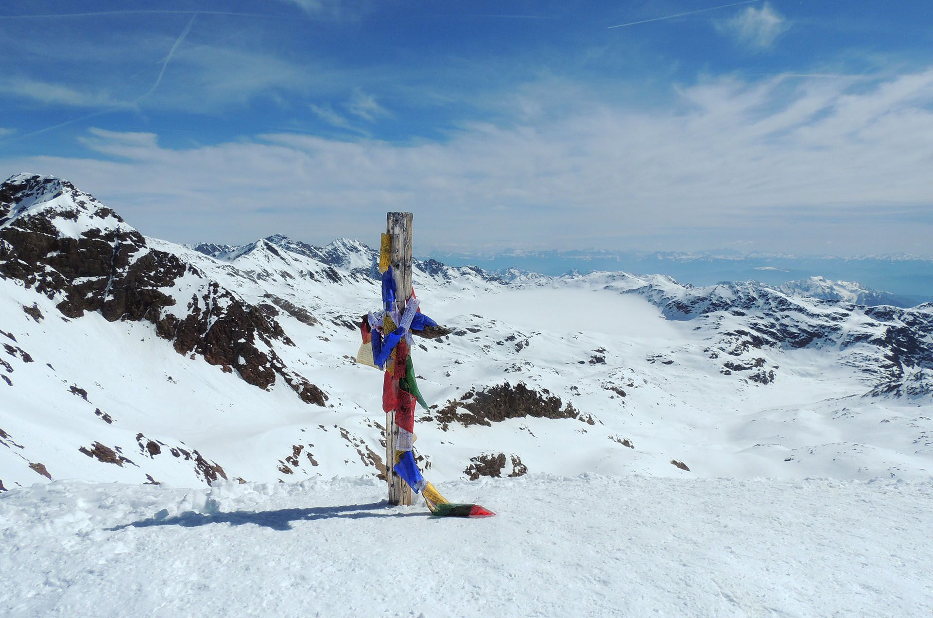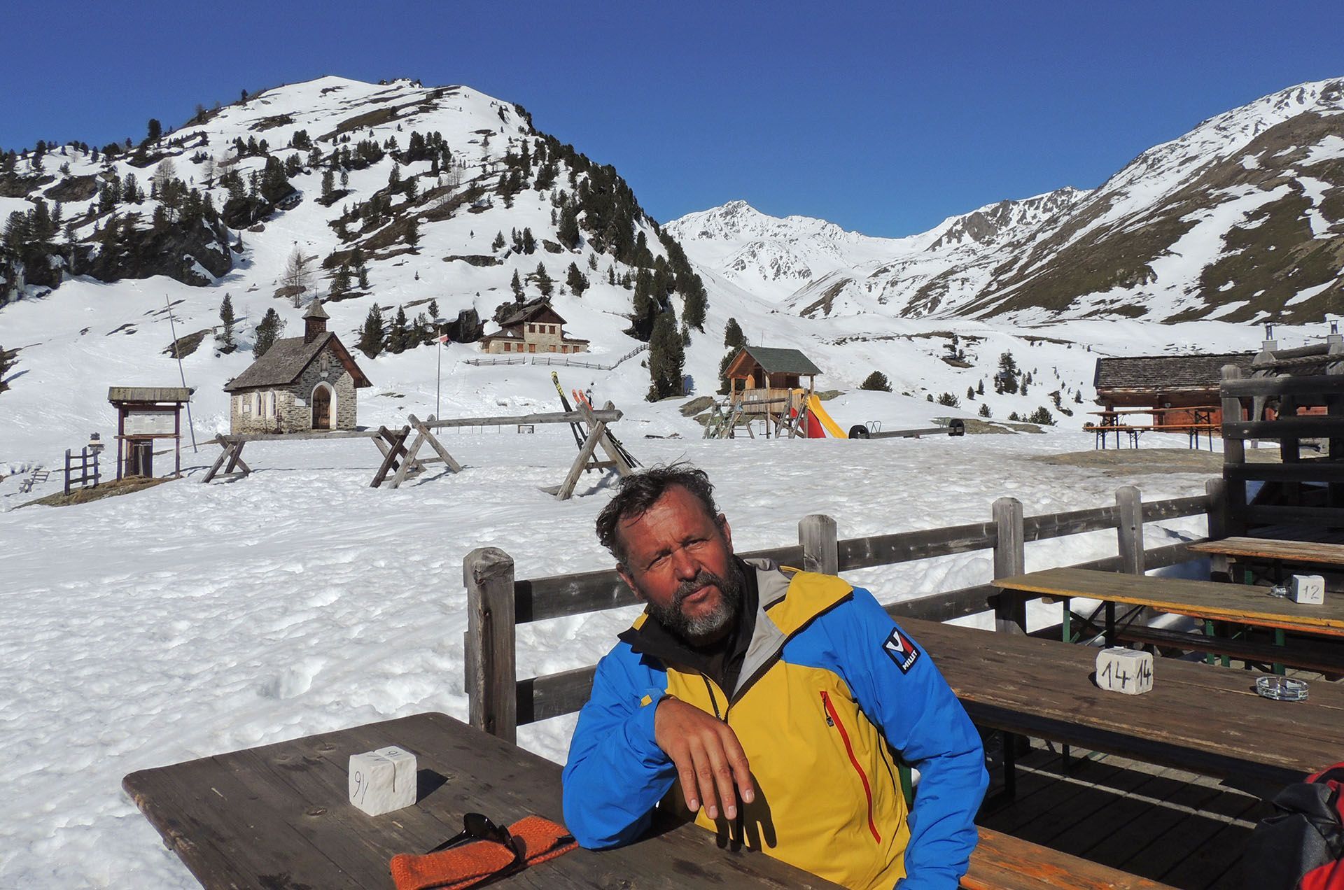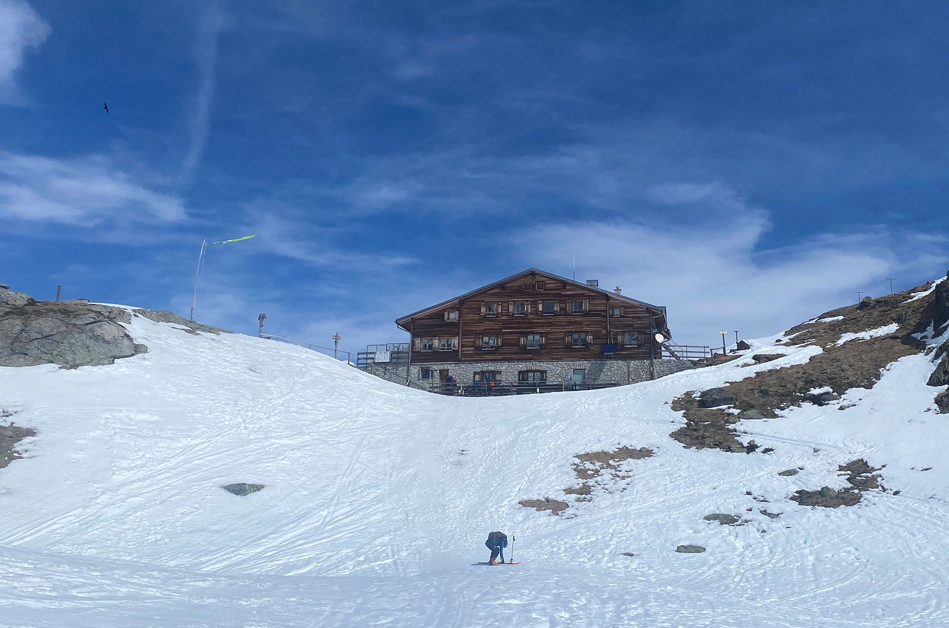 Da es so ganz ohne Hütte dann doch nicht geht, sind wir am dritten Tag unserer Tourenwoche auf die Martellerhütte (2585 m) umgezogen bzw. aufgestiegen. Diese hochalpine Hütte des Südtiroler Alpenvereins bietet einen atemberaubenden Ausblick auf die Zufallspitzen. Der Monte Cevedale, mit 3769 m der dritthöchste Gipfel der Ortler Alpen, versteckt sich etwas hinter diesen Gipfeln. Die Martellerhütte ist allerdings auch Ausgangspunkt für eine eher gemütliche aber lohnende Skitour auf die Köllkuppe (Cima Marmotta) am Marteller Hauptkamm. Belohnt wird der Aufstieg mit einer grandiosen Rundumsicht. Alles in allem ein echter Seniorenausflug ... obber schee wor’s.