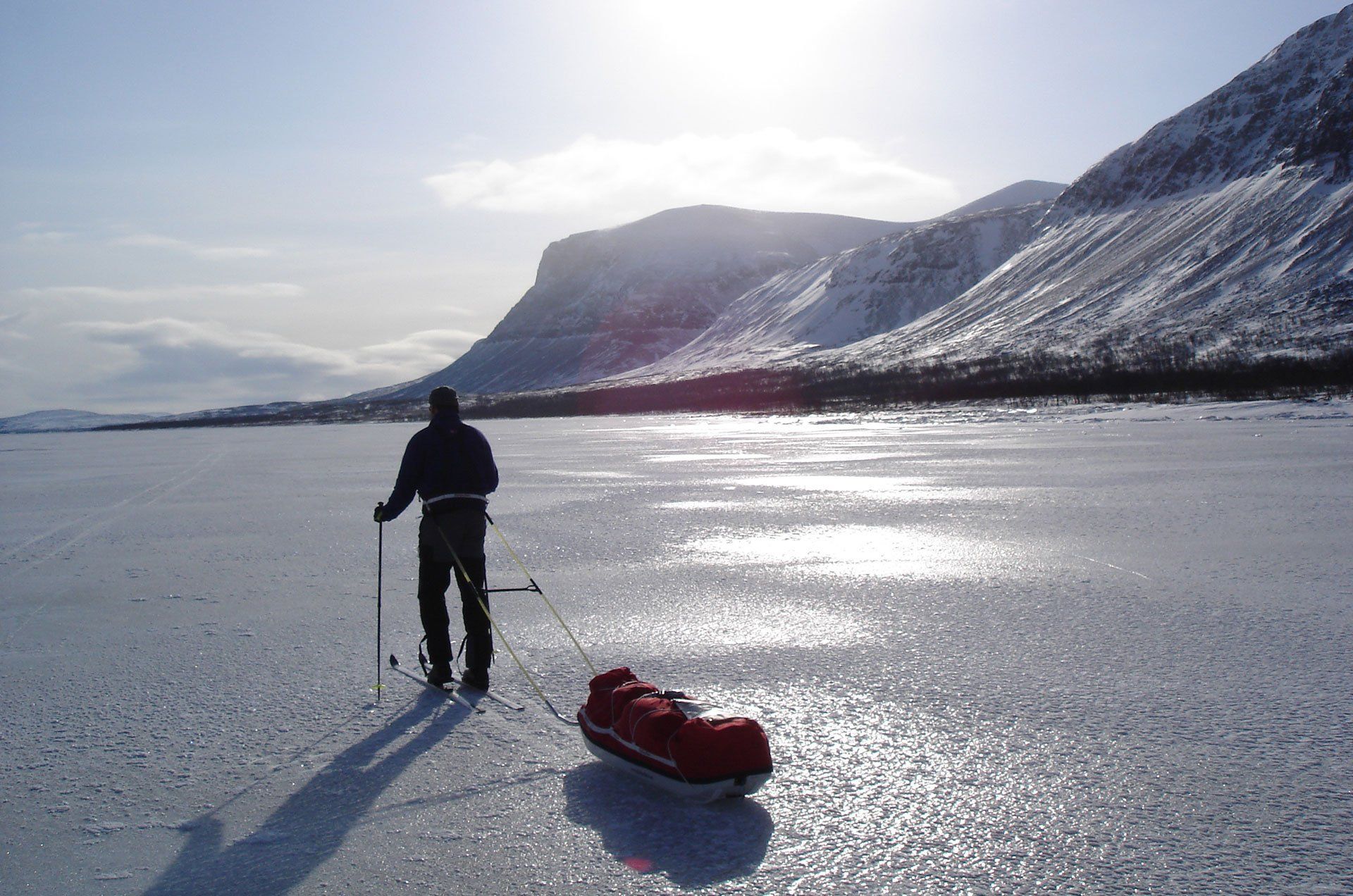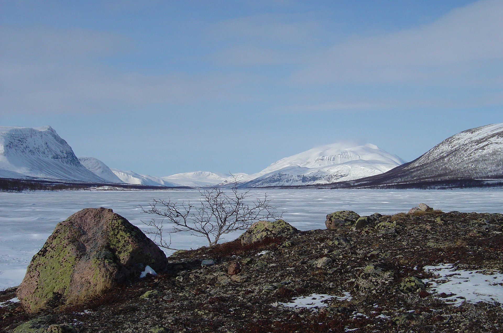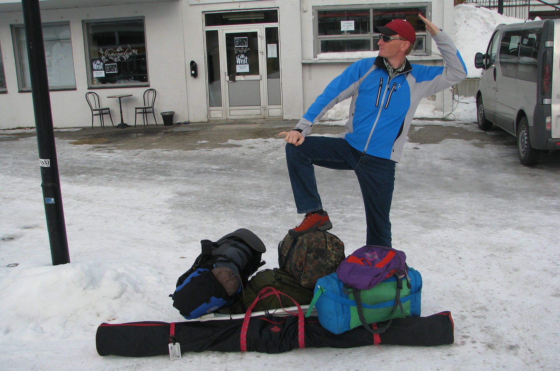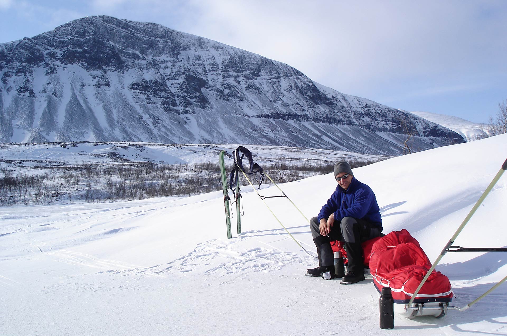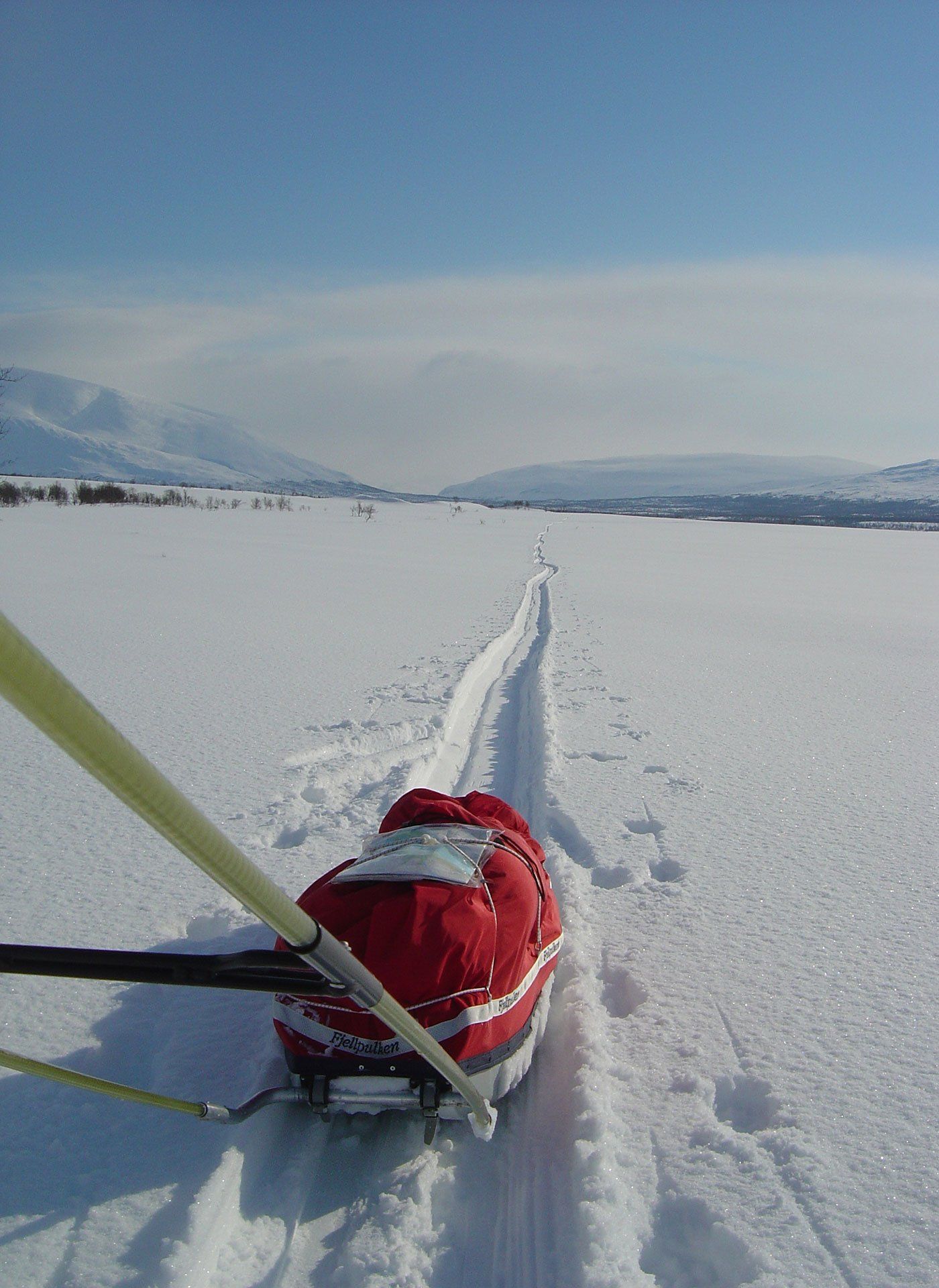 Mit dem Dividalen Nationalpark hatte ich noch eine Rechnung offen: Bei unserer Sommer-Trekkingtour waren wir ja wetterbedingt hoffnungslos „abgesoffen“ und stark steigende Flusspegel hatten eine Vollendung der geplanten Tour verhindert (siehe Eintourenleben/Bergsteigen/Trekking in der Indre Troms). Und so entstand an einem feucht-fröhlichen Herrenabend mit meinem Freund Stefan der Plan, den durch den Dividalen Nationalpark führenden Fernwanderweg „Nordkalottleden“ von Kilpisjärvi nach Inset im Frühjahr mit Pulka und Ski zu begehen. Wir hatten uns für Anfang April entschieden: Bereits Tag-Nacht-Gleiche, aber noch so früh im Jahr, dass wir mit ein wenig Glück auf Nordic Lights hoffen konnten. Unsere Anreise erfolgte mit dem Flugzeug nach Tromsö und von dort weiter mit einem Taxi nach Kilpisjärvi – dem nordwestlichsten Dorf Finnlands mit 114 Einwohnern. Ganz in der Nähe gibt es einen bekannten gelben Grenzstein, der das Dreiländereck Finnland, Norwegen und Schweden markiert. Läuft man um selbigen einmal herum, hat man mit wenigen Schritten drei Länder bereist.