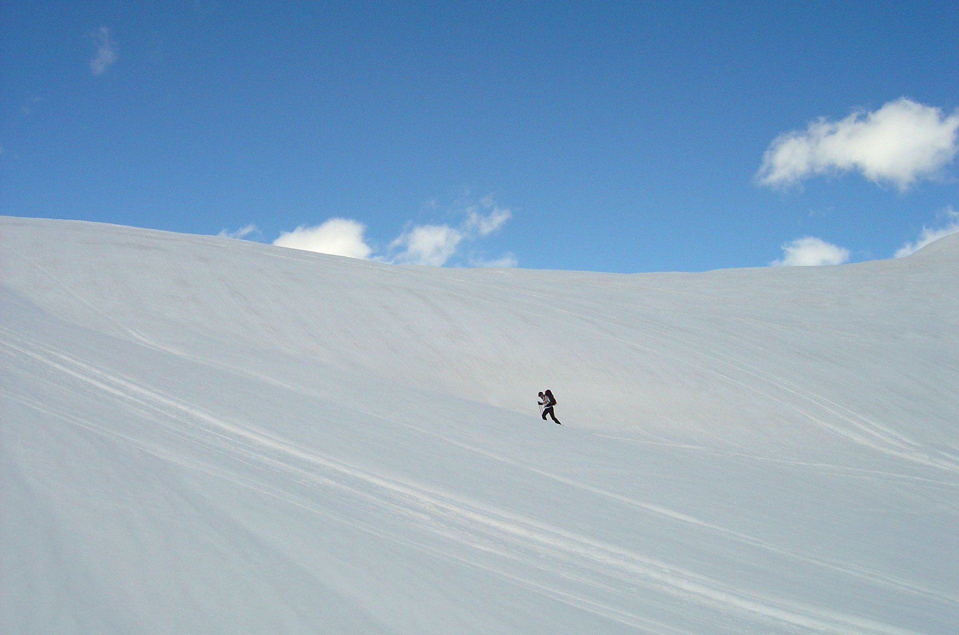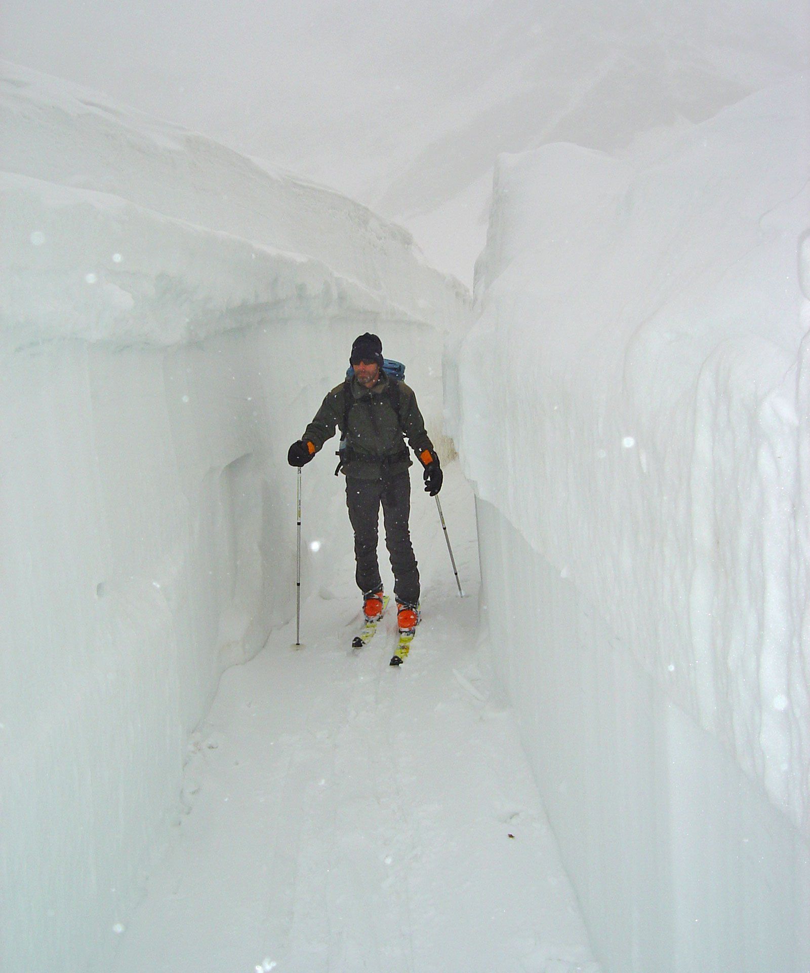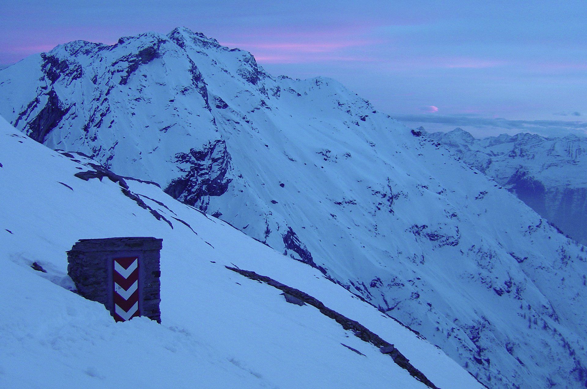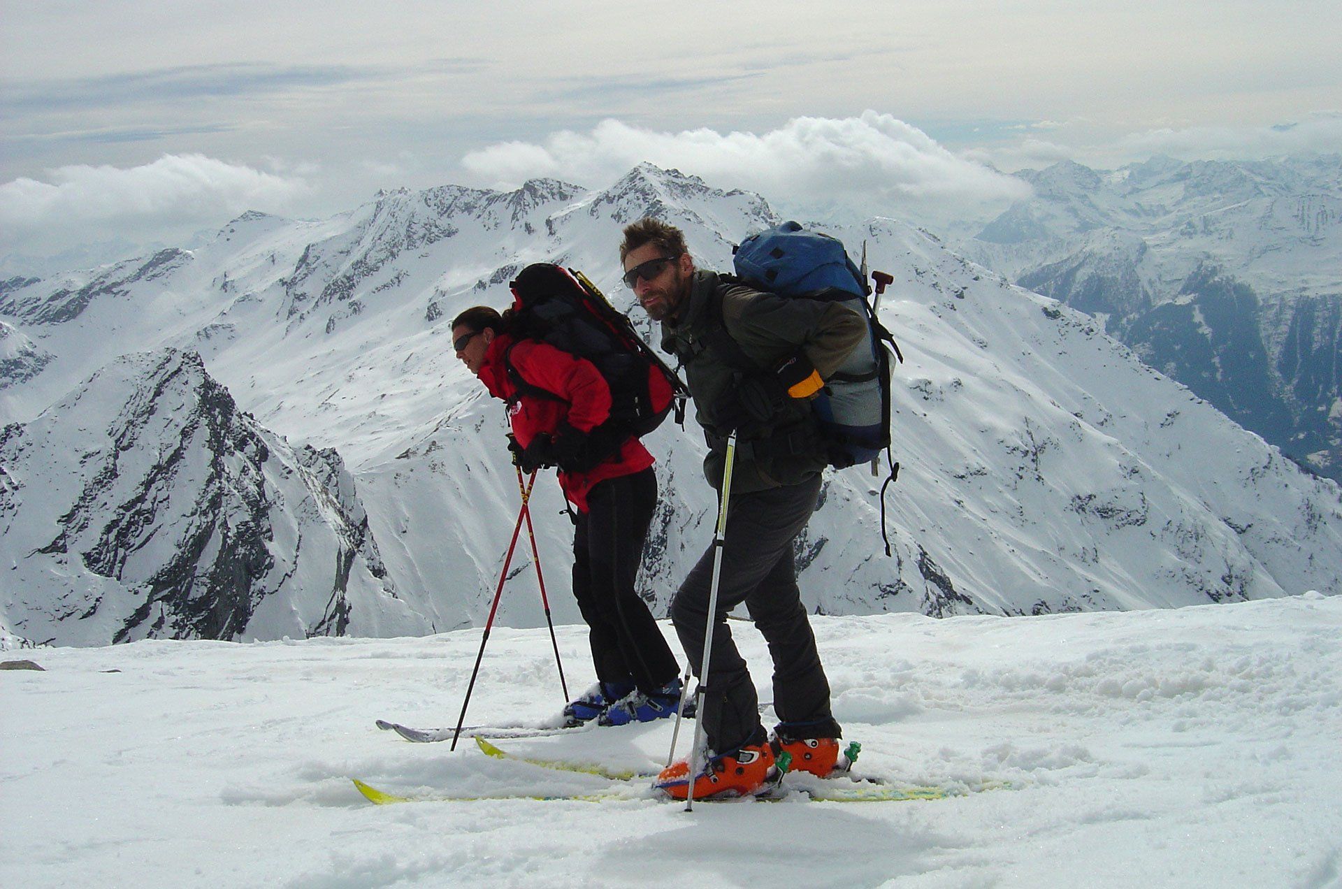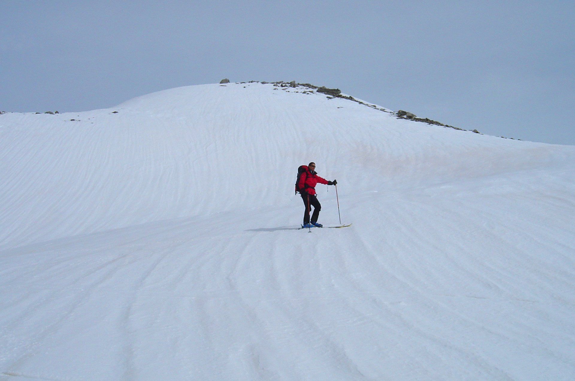 Die Tessin Haute Route: Eine lange Skitour mit 8 Tagesetappen und ca. 8000 Anstiegshöhenmetern, die bei den Hinterrheinquellen startet und sich bis zum Lago Maggiore hinzieht. Und genau das ist dann auch die Schwierigkeit dieser einsamen Route: Hat man an den Anfangstagen einen schönen Frühjahrsfirn, ist die Gefahr groß, den letzten Abschnitt mit den schweren Tourenstiefeln an den Füßen zu wandern. Oder es passt hintenraus, dann herrscht am Anfang unter Umständen noch ein ordentliches Lawinenrisiko. Wir sind damals zumindest bis zur Capanna Cristallina oberhalb des Furkapasses gekommen. Start war am Portal des San Bernadino Tunnels über den Panzerschießplatz des Schweizer Heeres auf die an einem mühsamen Buckel gelegene Zapporthütte. Mühsam vor allem dann, wenn man sich auf der letzten halben Stunde das Anlegen der Harscheisen sparen will (gedd’ scho!) und sich einen prügelhart gefrorenen Steilhang hinauf kämpfen muss.
