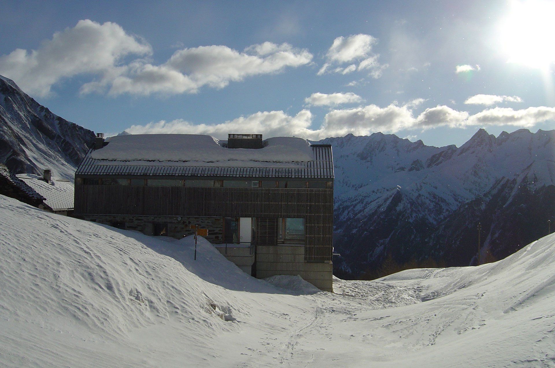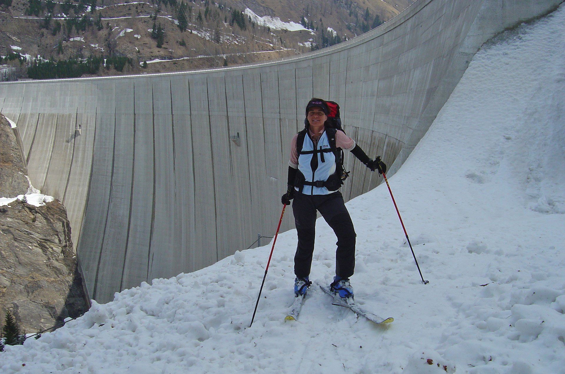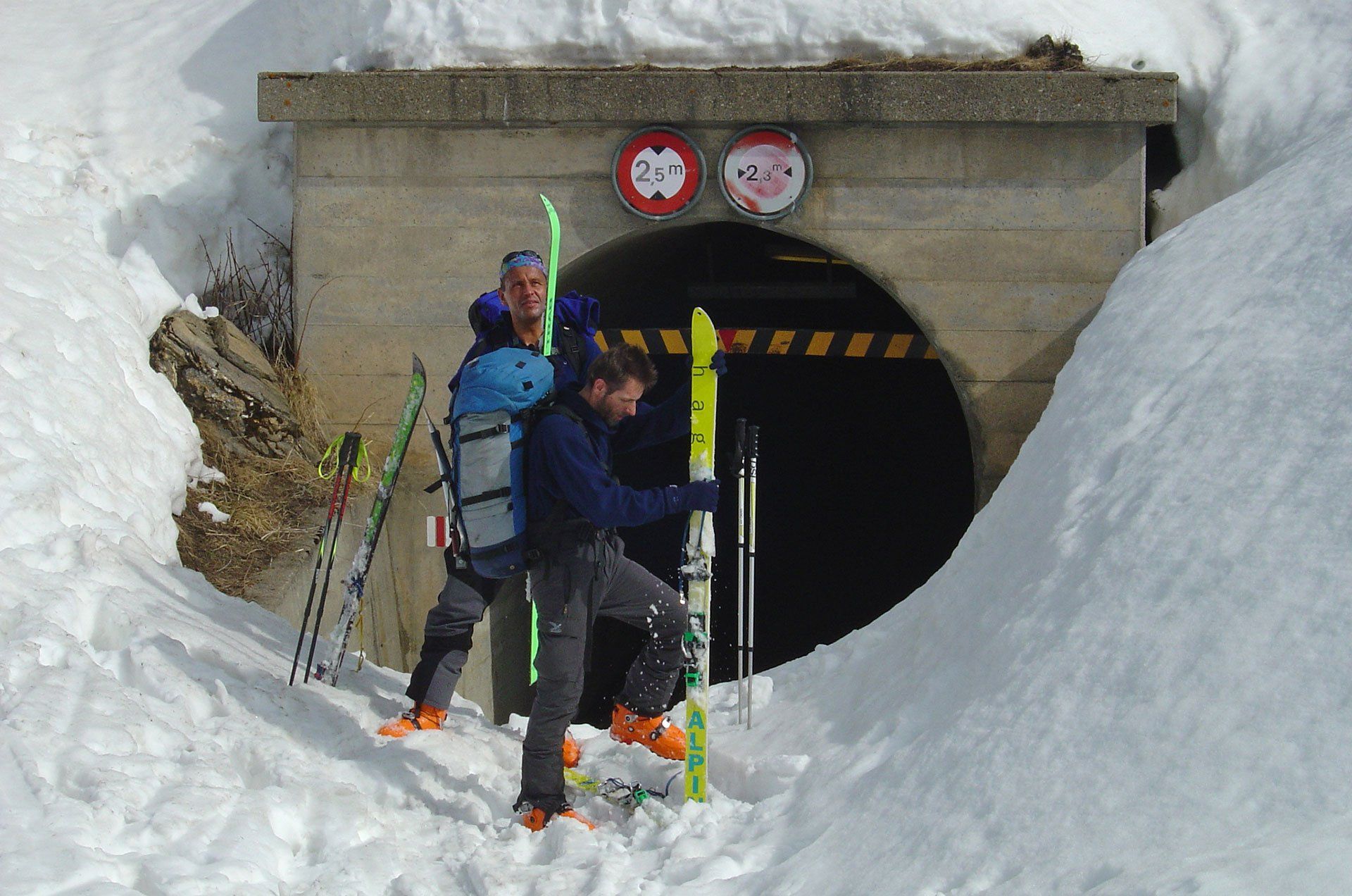 Weiter zur Capanna Adula UTOE (unterwegs den Gipfel des Rheinwaldhorns nicht vergessen), die wir uns nach der verdienten Ankunft erst einmal freischaufeln mussten. Am nächsten Morgen eine gemütliche Abfahrt durch weite Almböden in Richtung Luzzone Stausee. Zum Stausee kommt man aber nur durch einen – hoffentlich frei zugänglichen – stockfinsteren Tunnel. Erwischt man besagten Tunnel nicht, kann der werte Skitourist wieder den Rückmarsch antreten. Nach Überqueren der Stauseemauer hinunter ins Campo Blenio und wieder hinauf zur Capanna Boverina. Von der Boverina zur Capanna Cadagno und tief ins Tal nach Airolo. Gestärkt mit einer Riesenpizza ging mit dem gelben Postbus nach Ronco und nach einer gemütlichen Nacht unter 50 kg Gänsedaunen-Bettdecken auf die hochmoderne Capanna Cristallina. Bleibt noch zu erwähnen, dass wir auf allen von uns besuchten Hütten die einzigen Gäste waren. So soll’s sein.