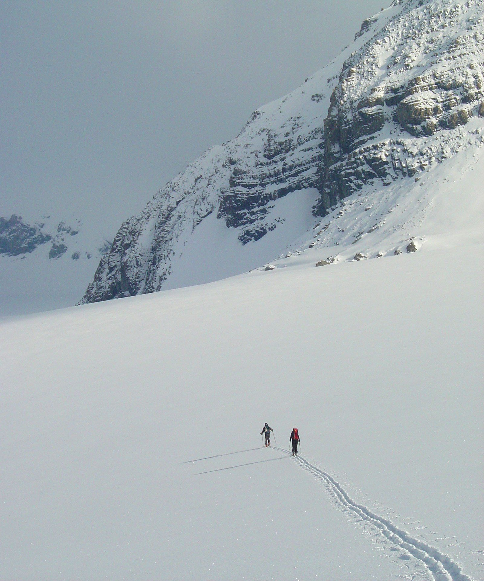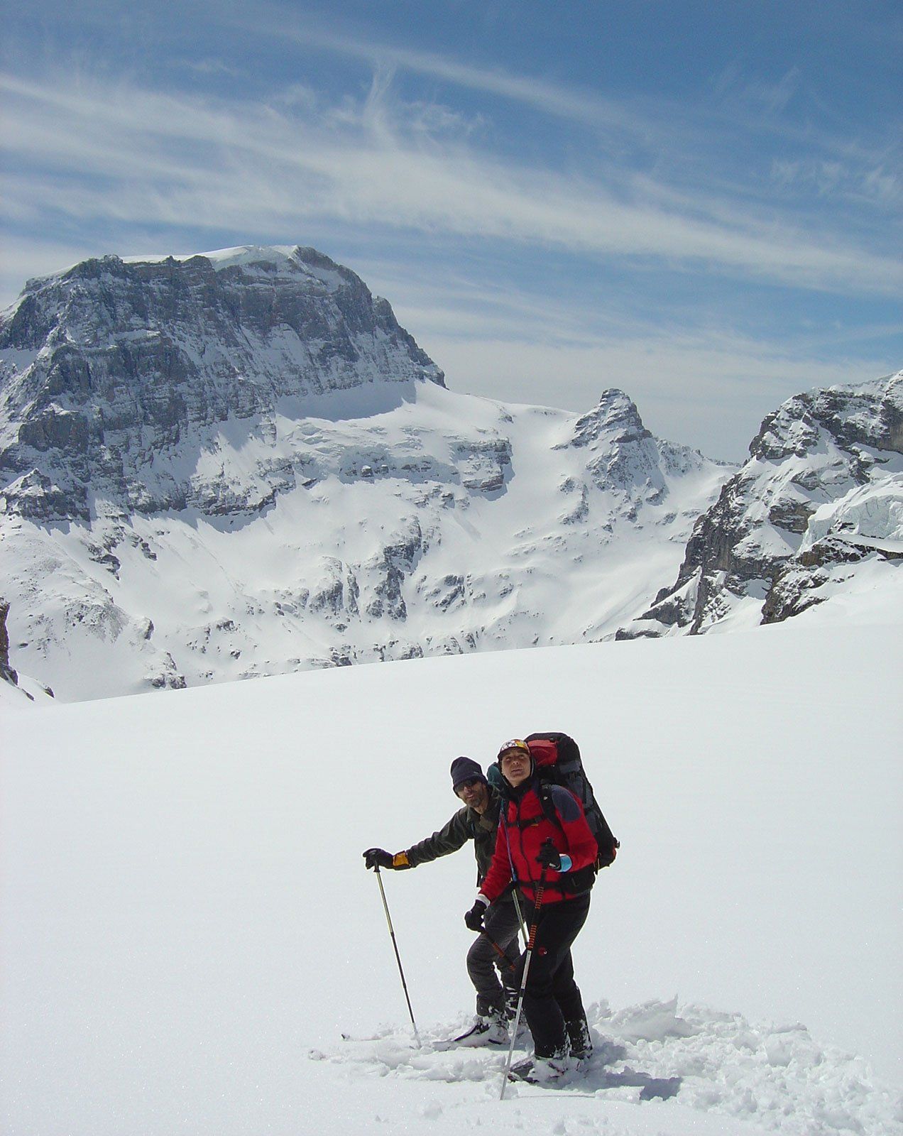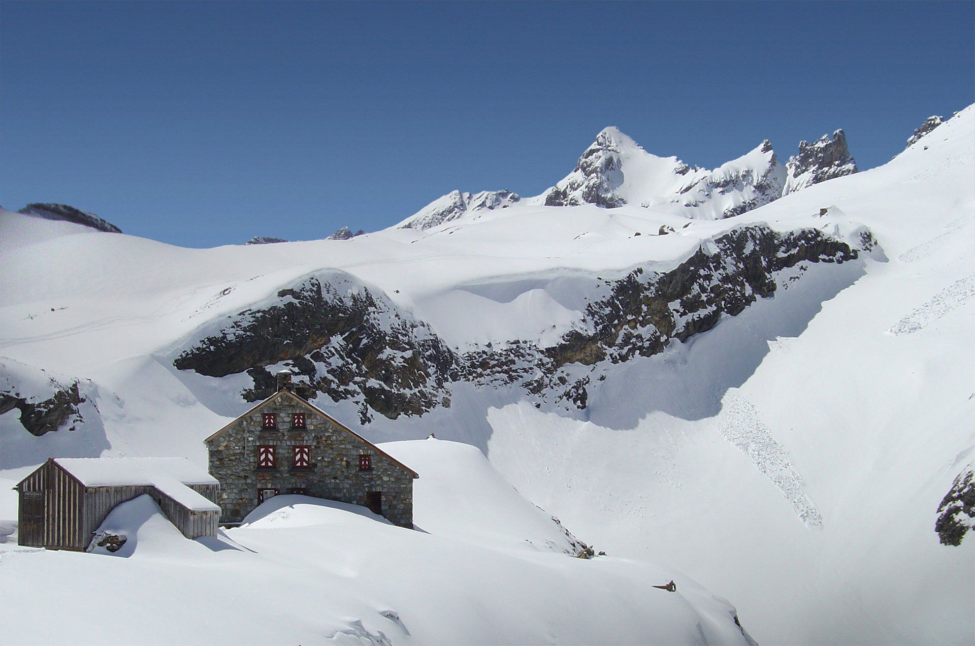 Wer am Walensee vorbei in Richtung Zürich fährt, vermutet kaum, welche großartige hochalpine Landschaft sich zur „Linken“ im Kanton Glarus verbirgt. Die Glarner Alpen und mit ihnen deren höchster Berg, der Tödi – auf Romanisch auch Piz Russein genannt. Mit knapp 3600 m ist der massige Klotz bei entsprechender Wetterlage gut aus dem 70 km entfernten Zürich zu sehen. In dieser alpinen Öde (= d’Öde = Tödi) versteckt sich eine ganz besondere Skirunde: Von Urnerboden mit einer kleinen Seilbahn auf den Fisetenpass, hinauf auf den Gemsfairenstock und hinab zur Claridenhütte, von hier zur Fridolinshütte, durch den Gletscherbruch auf den Tödi, und weiter zur Planurahütte, die von ihrer landschaftlichen Lage und Exponiertheit keiner Westalpenhütte nachsteht. Von hier über den Clariden mit einer rassigen Abfahrt zurück zum Klausenpass. Auf der zu dieser Jahreszeit meist noch gesperrten Passstraße angekommen, heißt es dann auf nette Schweizer warten, die zumindest ein Drittel des Eintourenleben-Teams wieder mit ins Tal nimmt. Nie werde ich vergessen, wie gut sich nach einer knappen Woche die abgetrocknete sonnenwarme Teerstraße des Klausen unter den nackten, durch Tourenstiefel geschundenen Füßen anfühlt.